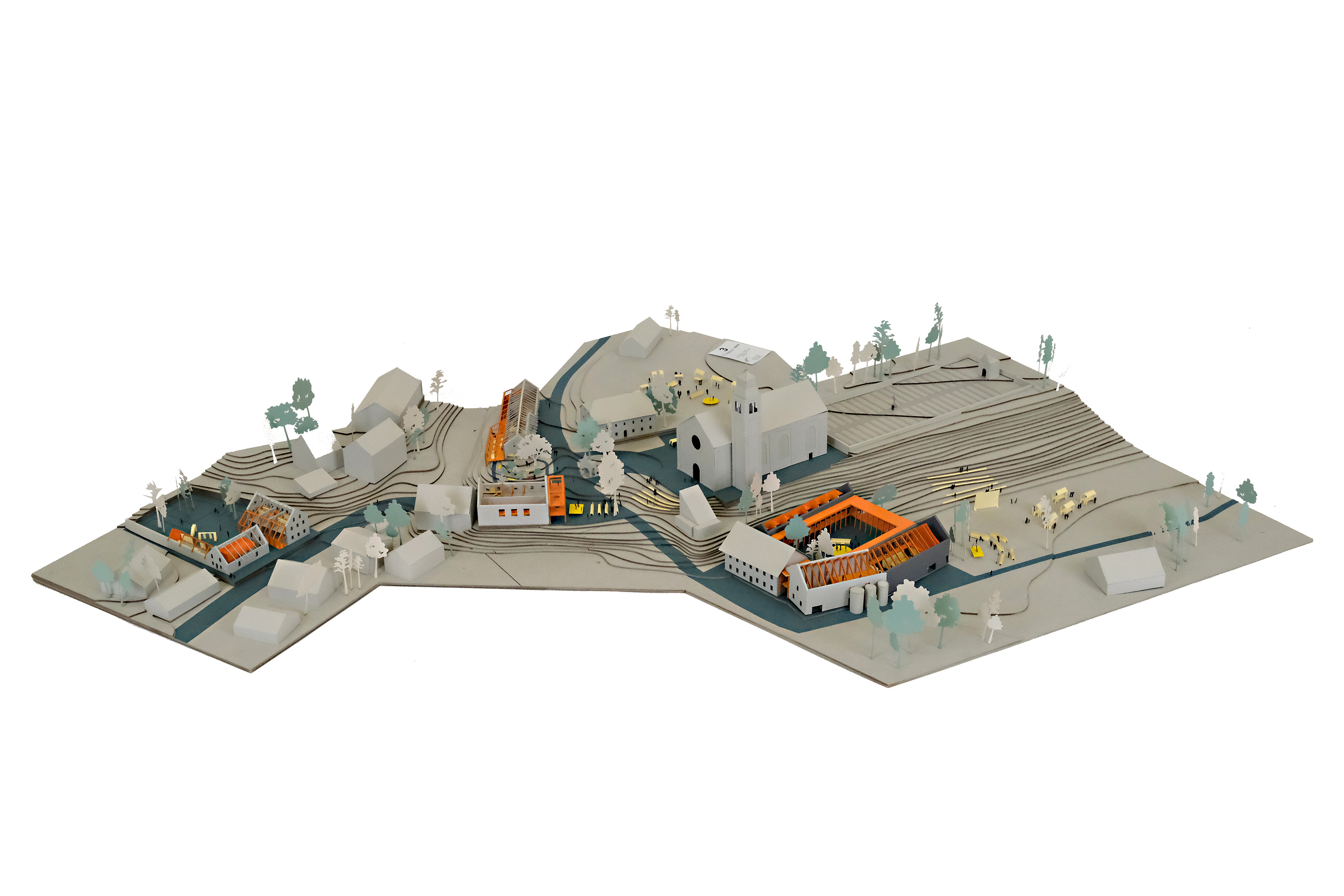V središču zasnove so trije med seboj povezani trgi, ki tvorijo hrbtenico nove kulturne poti skozi vas. Obstoječe objekte nadgrajujemo z novimi posegi: kulturni dom odpremo proti trgu in razširimo z leseno strukturo, ki deluje kot kulisa ali podaljšek prizorišča, vaška štala postane kavarna z dodatnimi prostori za njihov “Vaški vrt”, zapuščena domačija postane nov park, na katerem stoji knjižnica in podaljšano bivanje za varstvo osnovnošolskih otrok iz OŠ Smlednik.